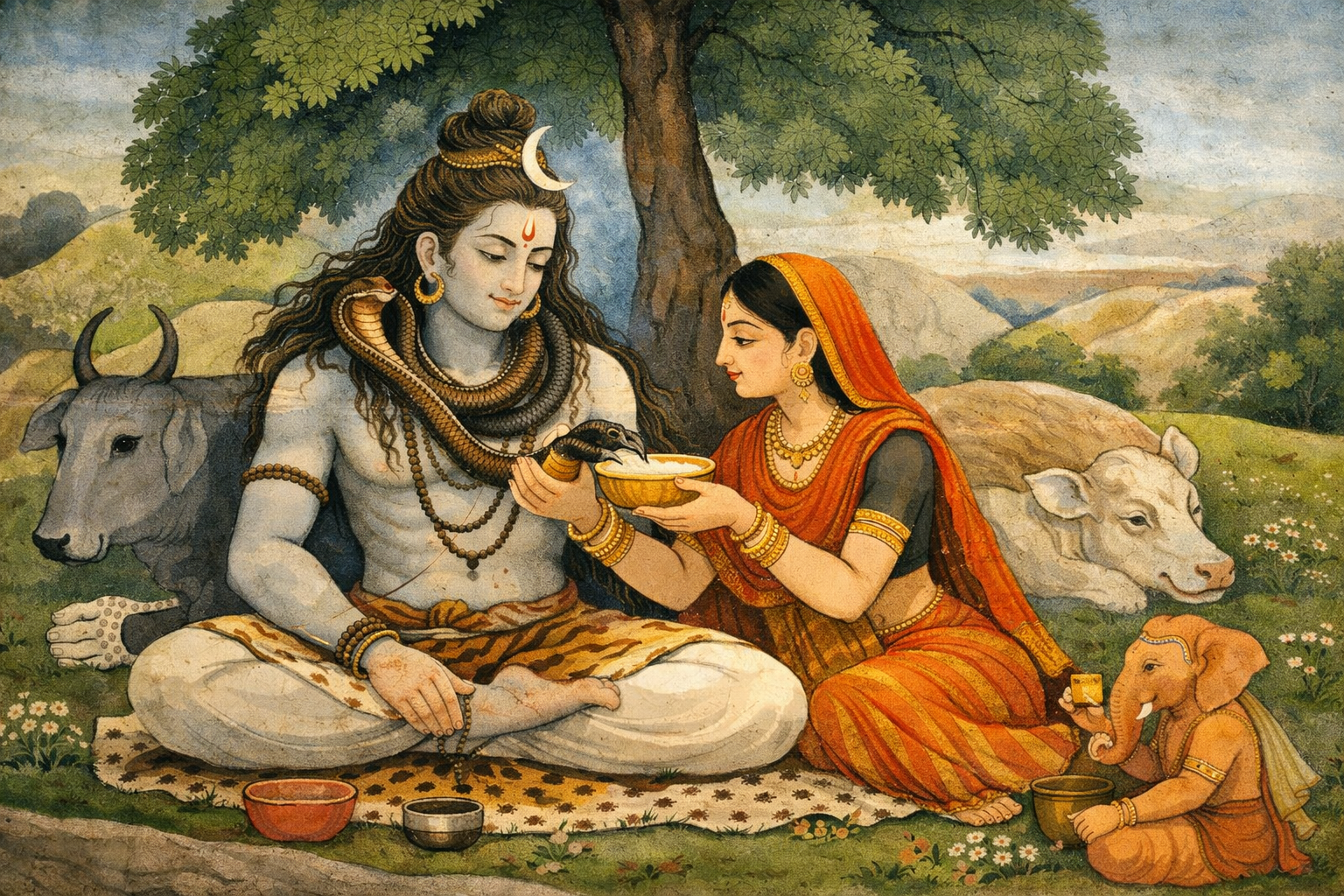 🕉️ Story of Lord Shiva (as shown in the image) Lord Shiva, the Mahadeva, is the supreme yogi and destroyer of ignorance. After renouncing worldly life, he chose the Himalayan forests as his abode, living a life of deep meditation, simplicity, and detachment. 🌿 Shiva – The Ascetic 🌺 Parvati – Shakti, the Divine Energy 🌳 Life in …